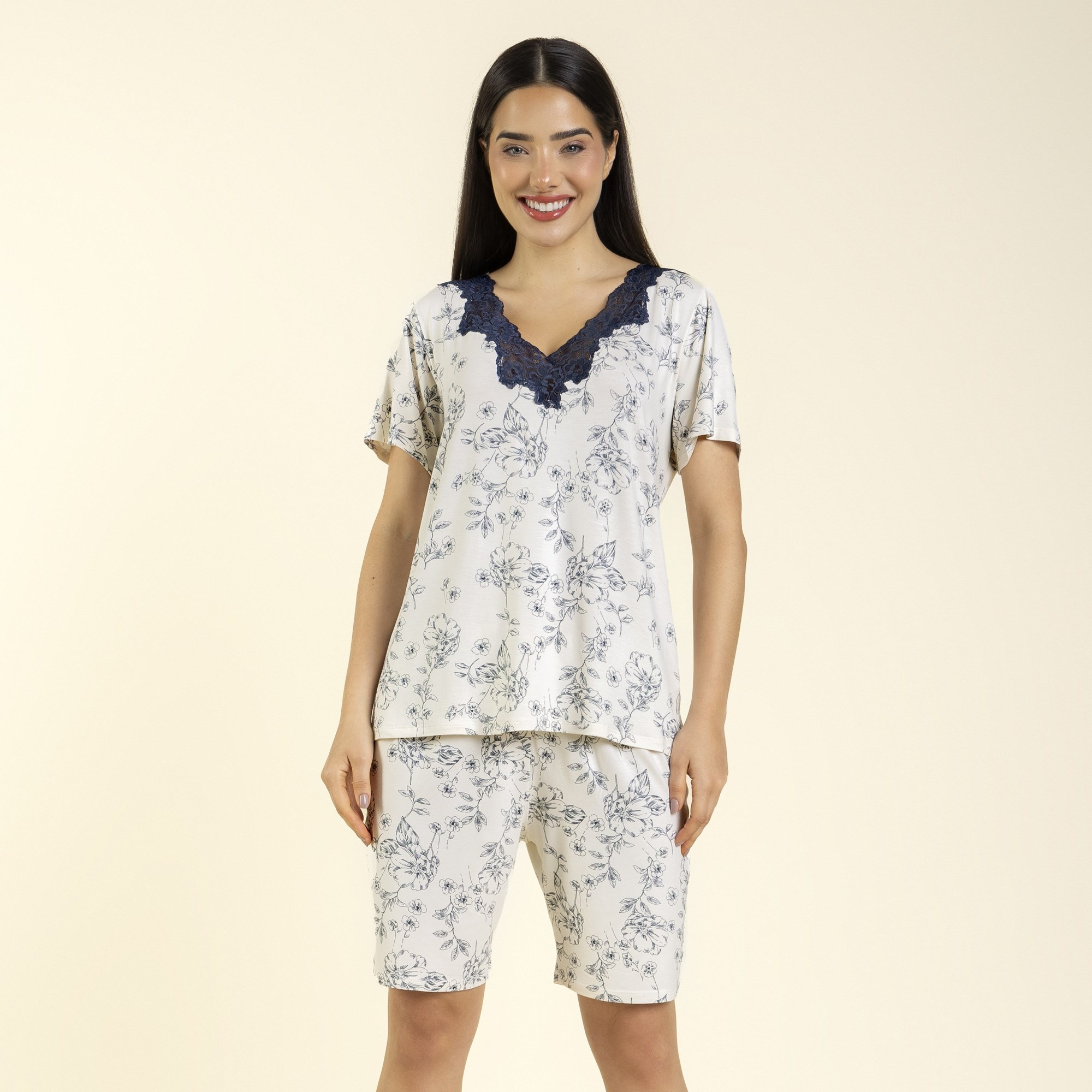 O modelo com estampa blossom azul platinum, em visco comfort, é composto por blusa de mangas curtas, bermuda soltinha e detalhe em renda no decote, garante um visual charmoso e toque macio.