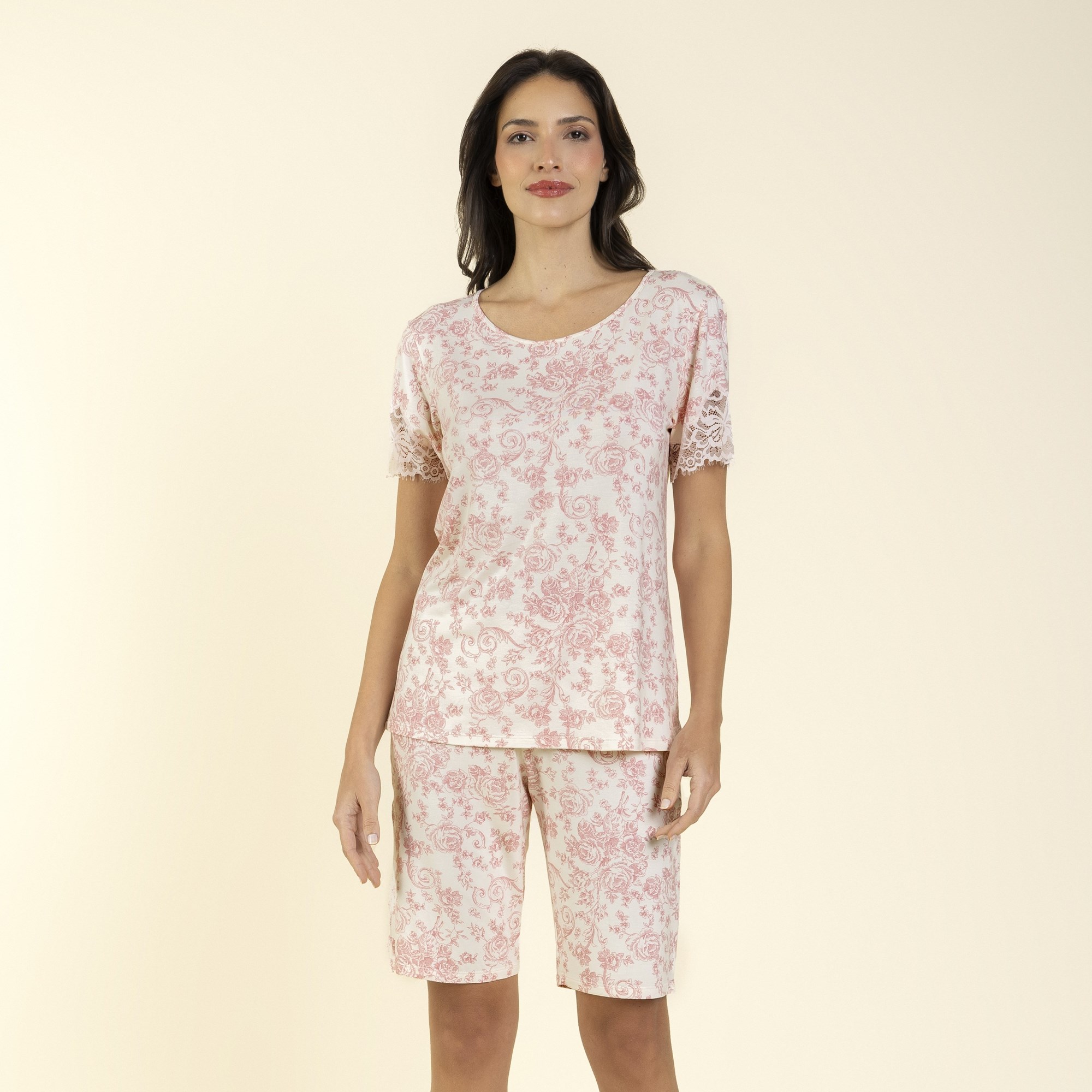 O conjunto, em visco comfort, tem blusa de manga curta, decote arredondado, estampa roses e renda nas mangas. A bermuda fica um pouco acima do joelho, é leve, possui renda na barra e estampa roses.