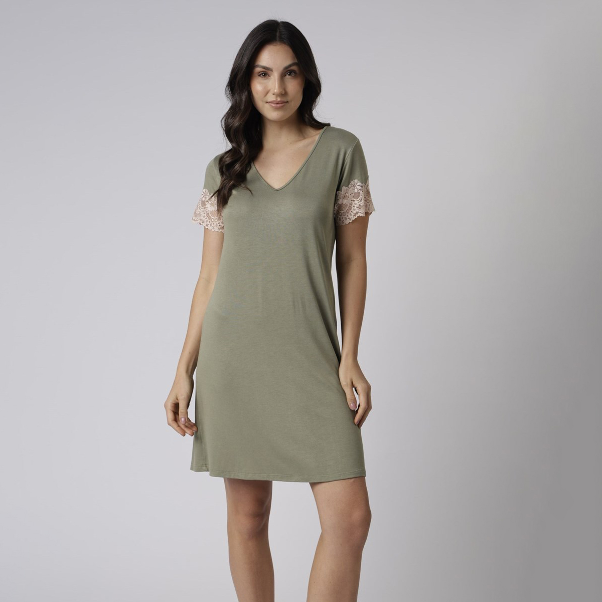 Confeccionada em visco tricot, tem manga curta, decote levemente em ‘V’, toque suave, caimento fluido e comprimento curto. A cor verde oliva e a renda valorizam o visual com elegância discreta.