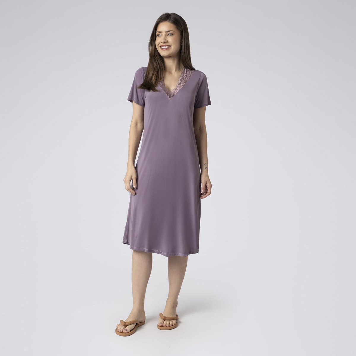 Com decote em ‘V’ com renda delicada e manga curta, a peça, em microfibra poliamida, valoriza o busto com caimento leve e toque sedoso. A cor malva celinda traz sofisticação e delicadeza para momentos de descanso.