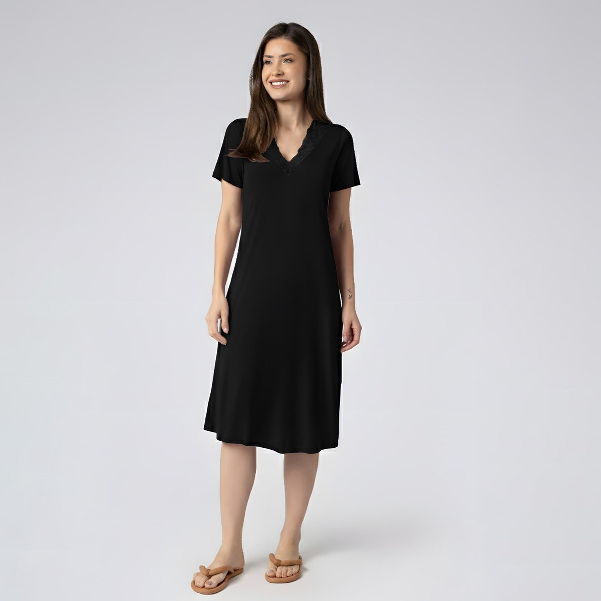 Com decote em ‘V’ com renda delicada e manga curta, o modelo, em microfibra poliamida, valoriza o busto com caimento leve. A cor preta traz delicadeza para momentos de descanso.