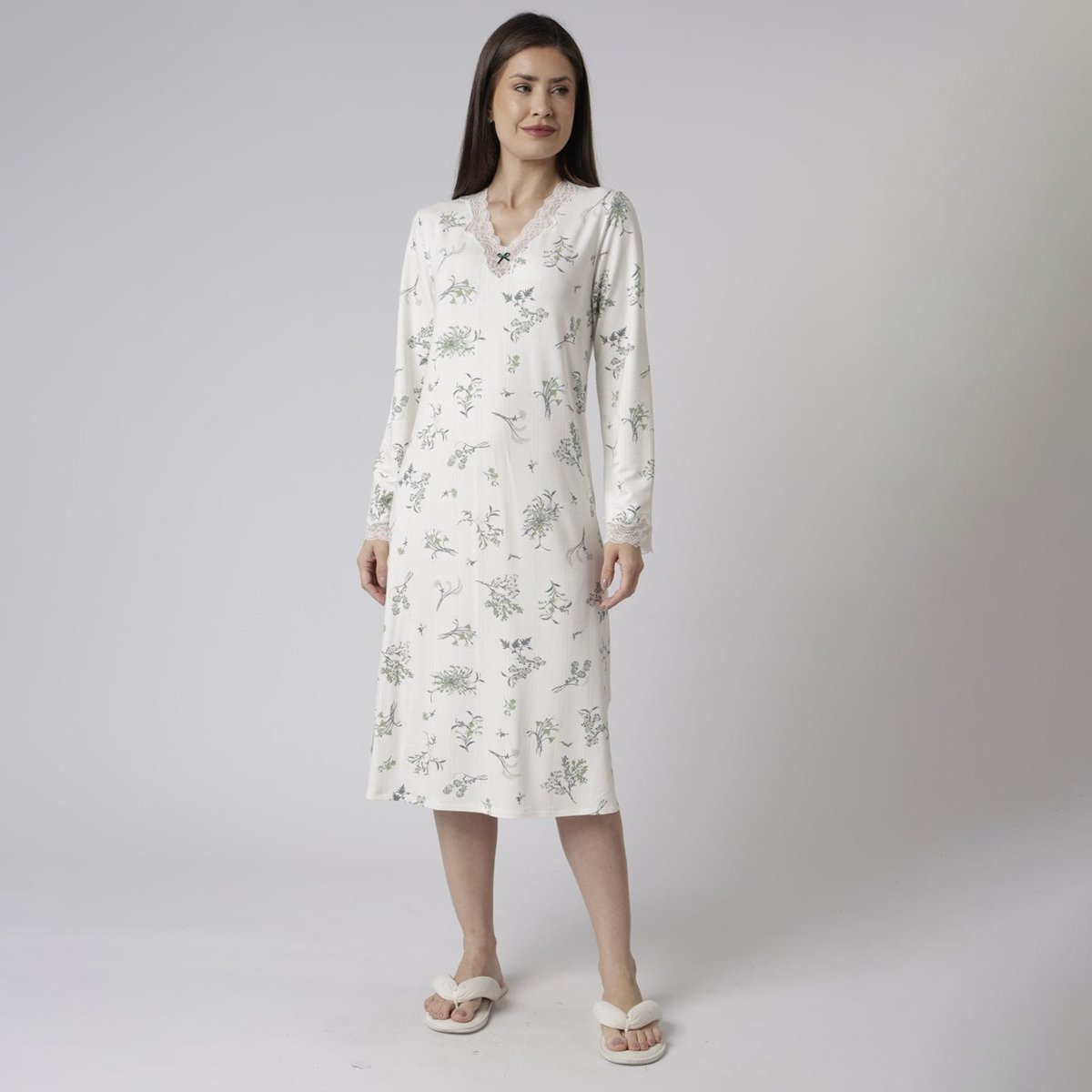 O modelo, em moletinho viscose, apresenta comprimento midi, mangas longas e decote delicado, com acabamento suave que valoriza o caimento. A estampa botânica adiciona um toque natural e sofisticado à peça.