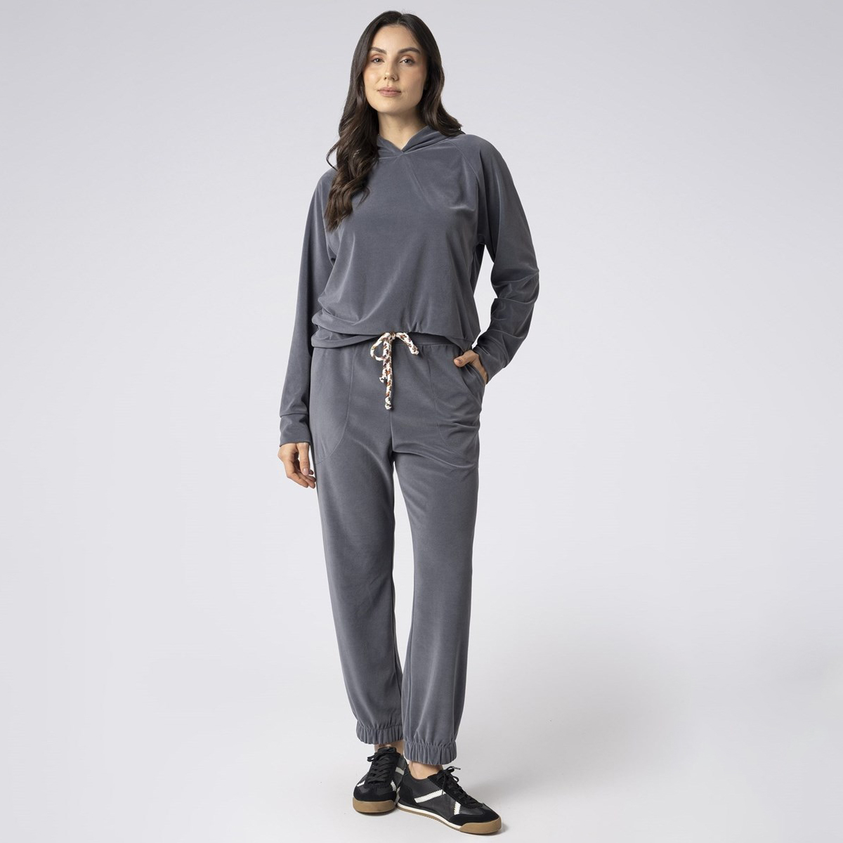 Produzido em plush ultramicro, o modelo apresenta blusa com manga raglan, capuz e cordão colorido ajustável. A calça possui bolsos funcionais e elástico confortável na barra, que não aperta. A cor cinza chumbo confere modernidade e versatilidade ao conjunto.