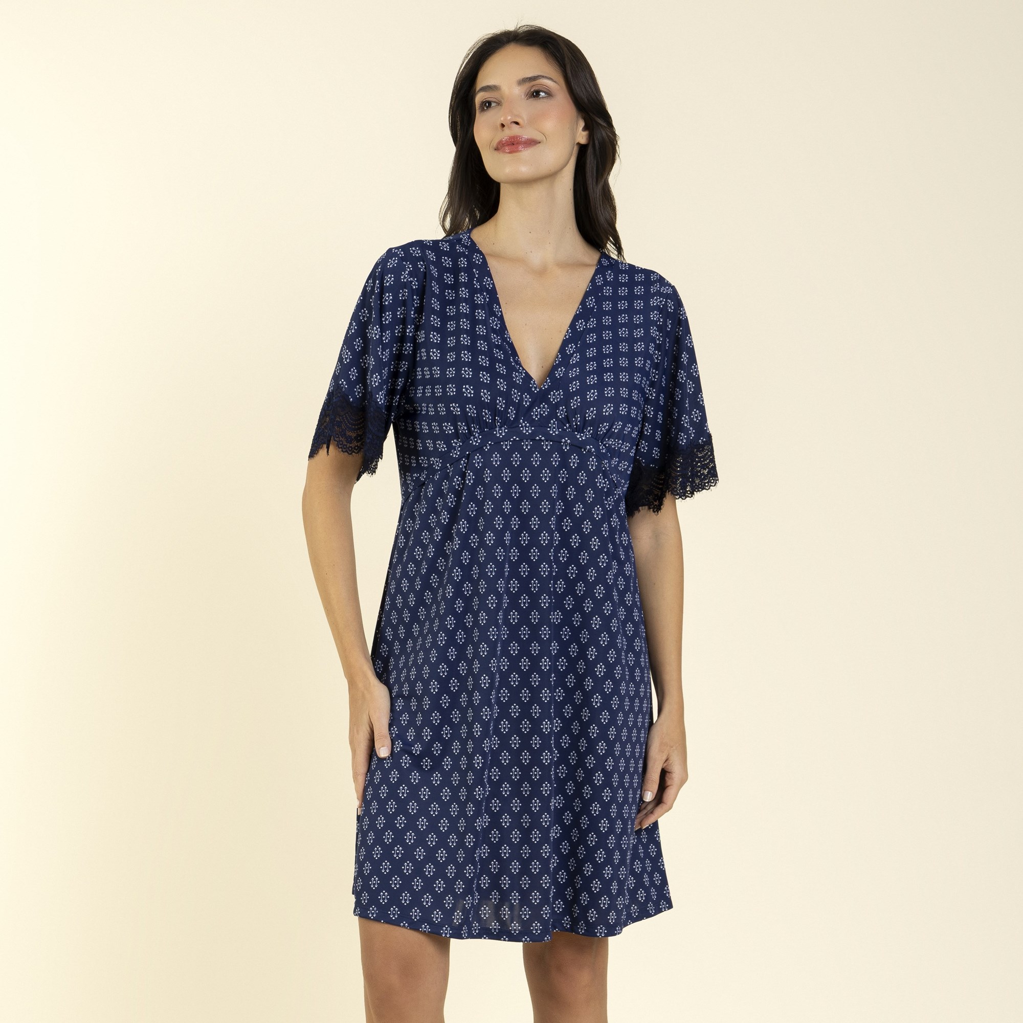 Feito em microfibra poliamida, é curto, tem manga curta, decote em 'V', estampa gravataria azul, renda na manga e caimento soltinho.