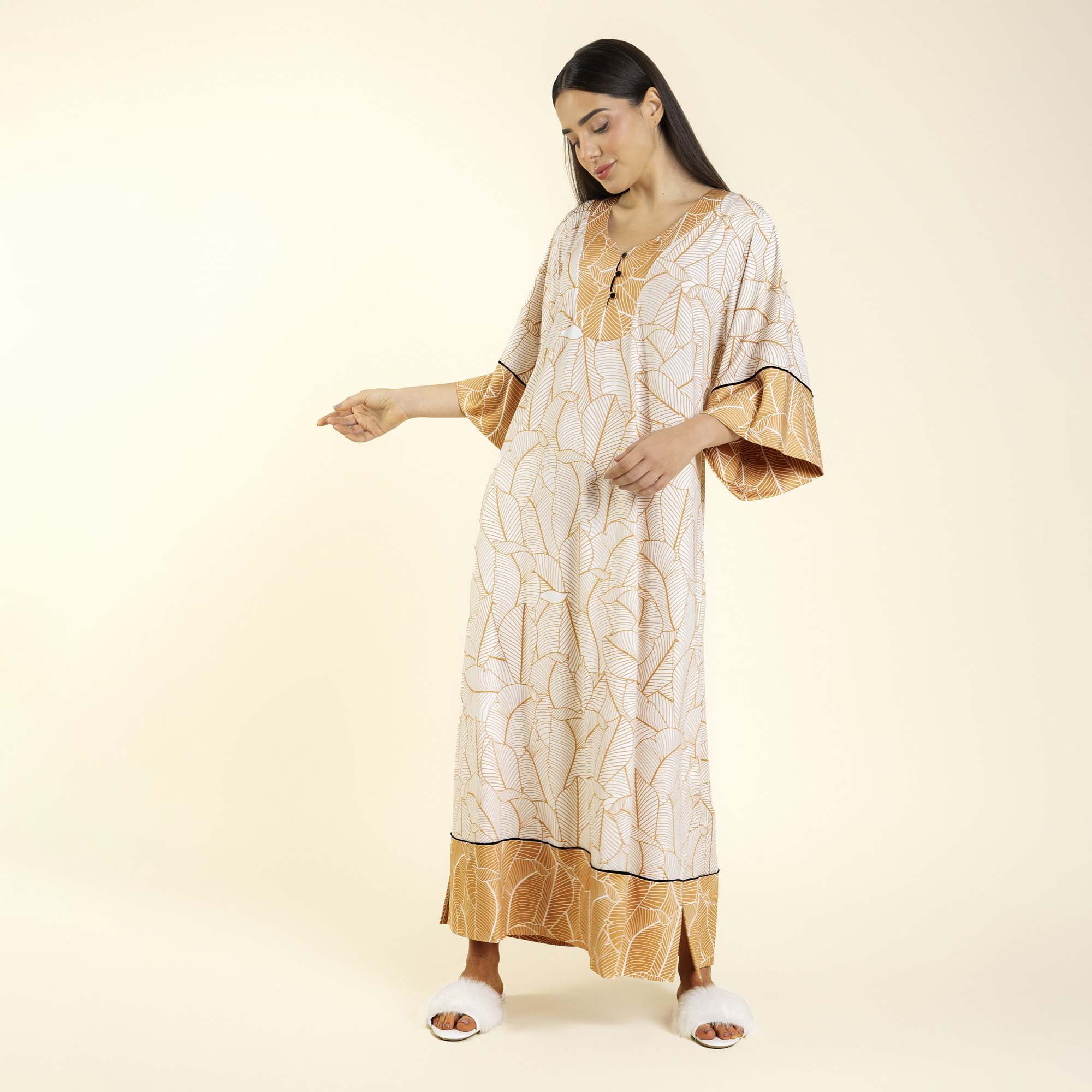 O kaftan, em microfibra light, é longo, tem manda flarê 7/8, decote com botão e estampa folha off white e gold.