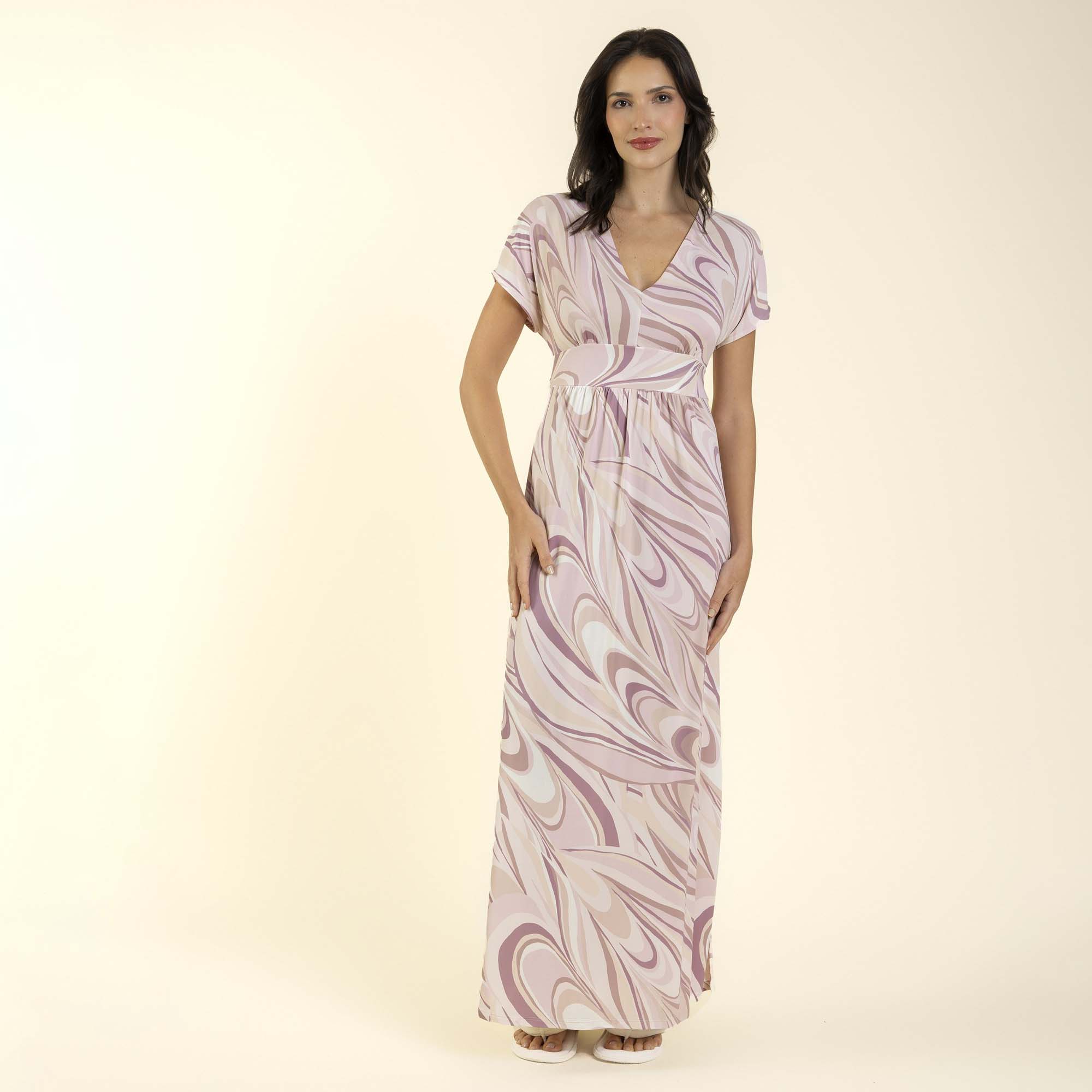 O modelo, em microfibra poliamida, é longo, possui mangas curtas, decote em 'V', faixa fixa na cintura, acentuando a beleza e elegância de cada mulher, além da linda cor lilás com estampa embru art.