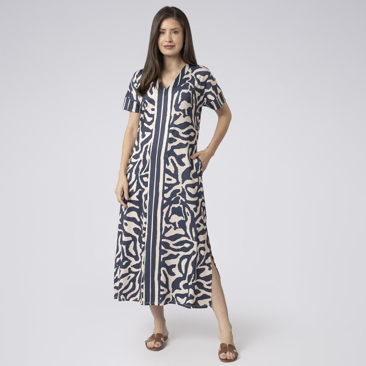 O modelo, em microfibra light, apresenta comprimento midi, decote em “V” com recorte embutido em estampa listrada contrastante, mangas curtas e caimento fluido. A estampa marinho orgânico traz modernidade e sofisticação ao visual.
