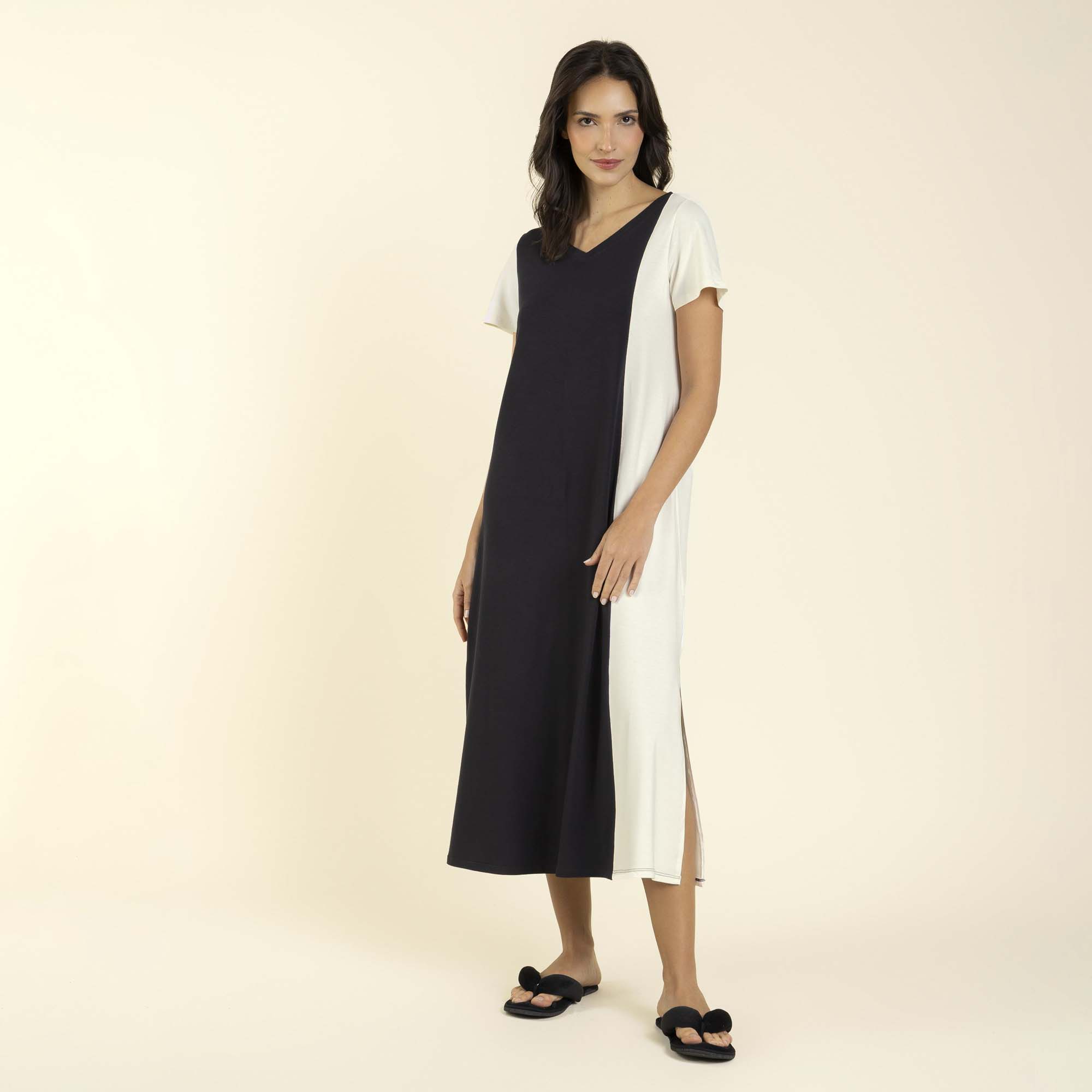 Produzido em visco comfort, tem modelagem solta, comprimento midi, fenda e detalhe off white em contraste nas mangas e lateral, trazendo charme ao visual.
