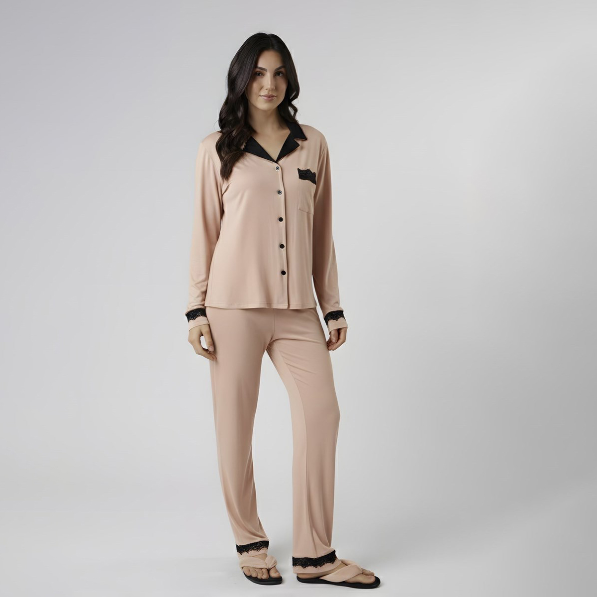 Produzido em visco maquinetada, possui blusa com gola esporte, bolso e manga longa, além do detalhe em cor contrastante preto para mais elegância e sofisticação. A calça possui caimento leve, toque macio e detalhe na barra na cor preto. A cor grão reforça a proposta clássica e versátil da peça.