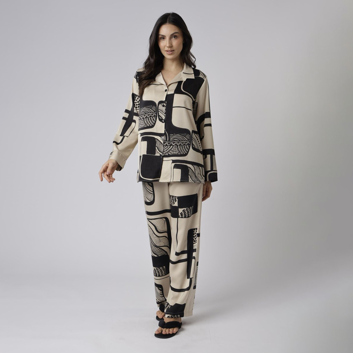Confeccionado em tecido plano acetinado, o modelo possui blusa de mangas longas com fechamento frontal e calça longa, proporcionando brilho discreto e caimento elegante, além da estampa abstrata.