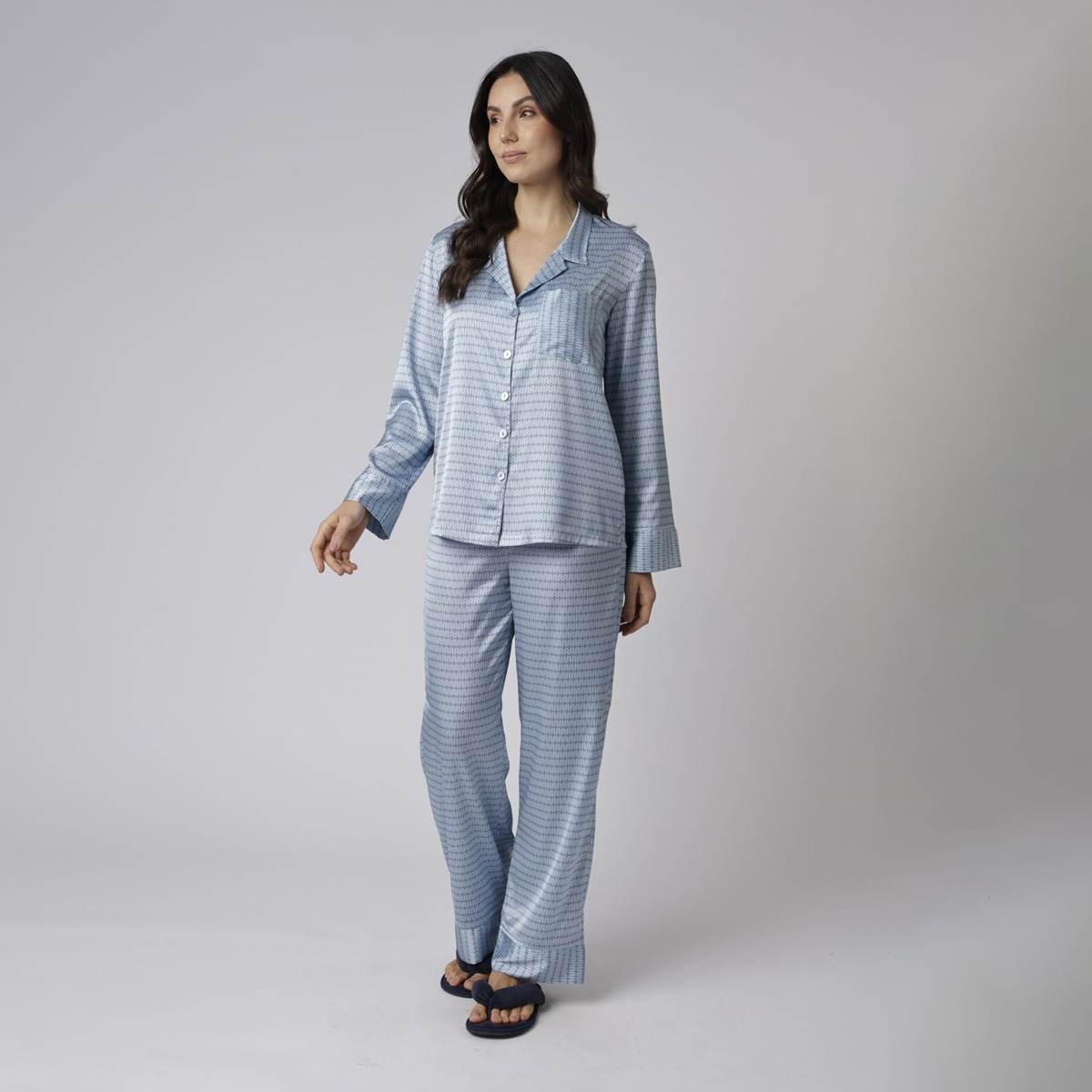 Confeccionado em cetim gloss, o modelo possui caimento fluido, toque suave, camisa aberta de mangas longas, bolso frontal e calça confortável. A estampa Geométrico Blue traz modernidade e sofisticação ao visual.