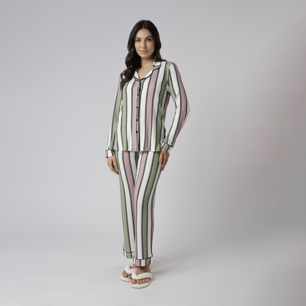 Produzido em visco comfort, apresenta toque macio, modelagem confortável, blusa de mangas longas com gola esporte e botões, além da calça fluida. A estampa listrado style traz identidade e modernidade à peça.