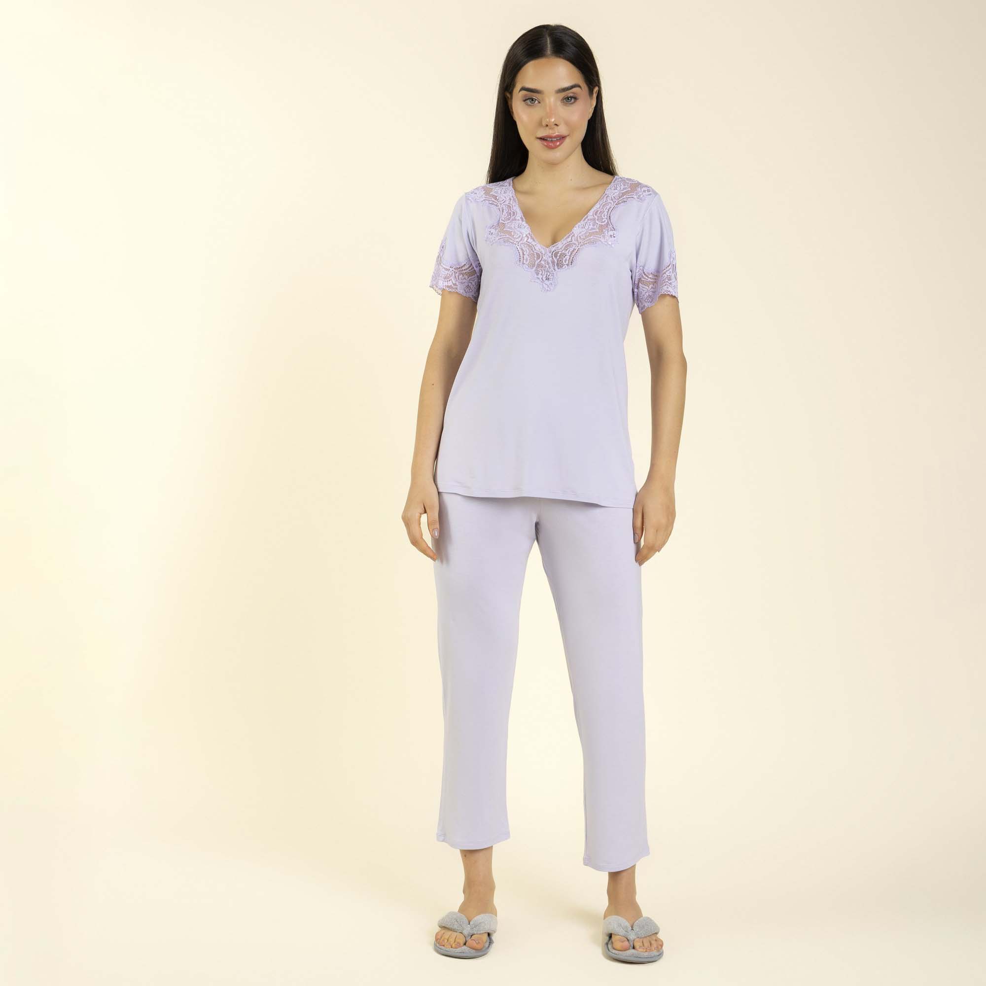 Possui blusa de manga curta com delicado acabamento em renda no decote e nas mangas e cor lilás galáxia. A calça capri, na mesma cor, garante liberdade de movimentos.