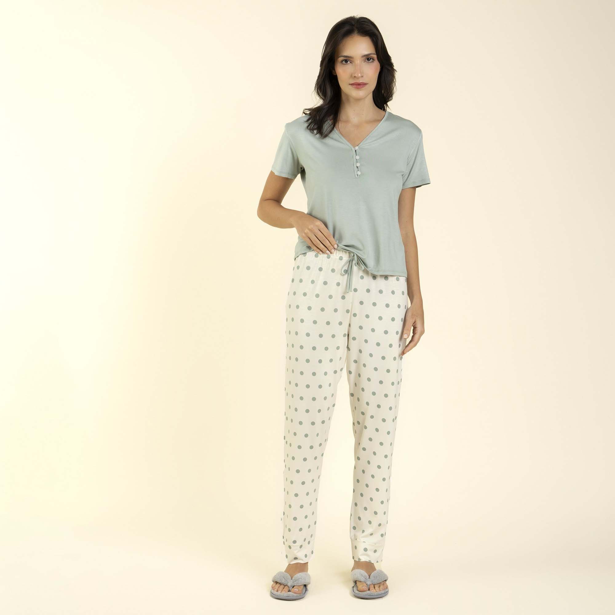 Confeccionado em Visco Comfort, o pijama é composto por blusa estilo henley cor verde e calça longa com estampa poá green e acabamento delicado, garantindo bem-estar durante todo o uso.