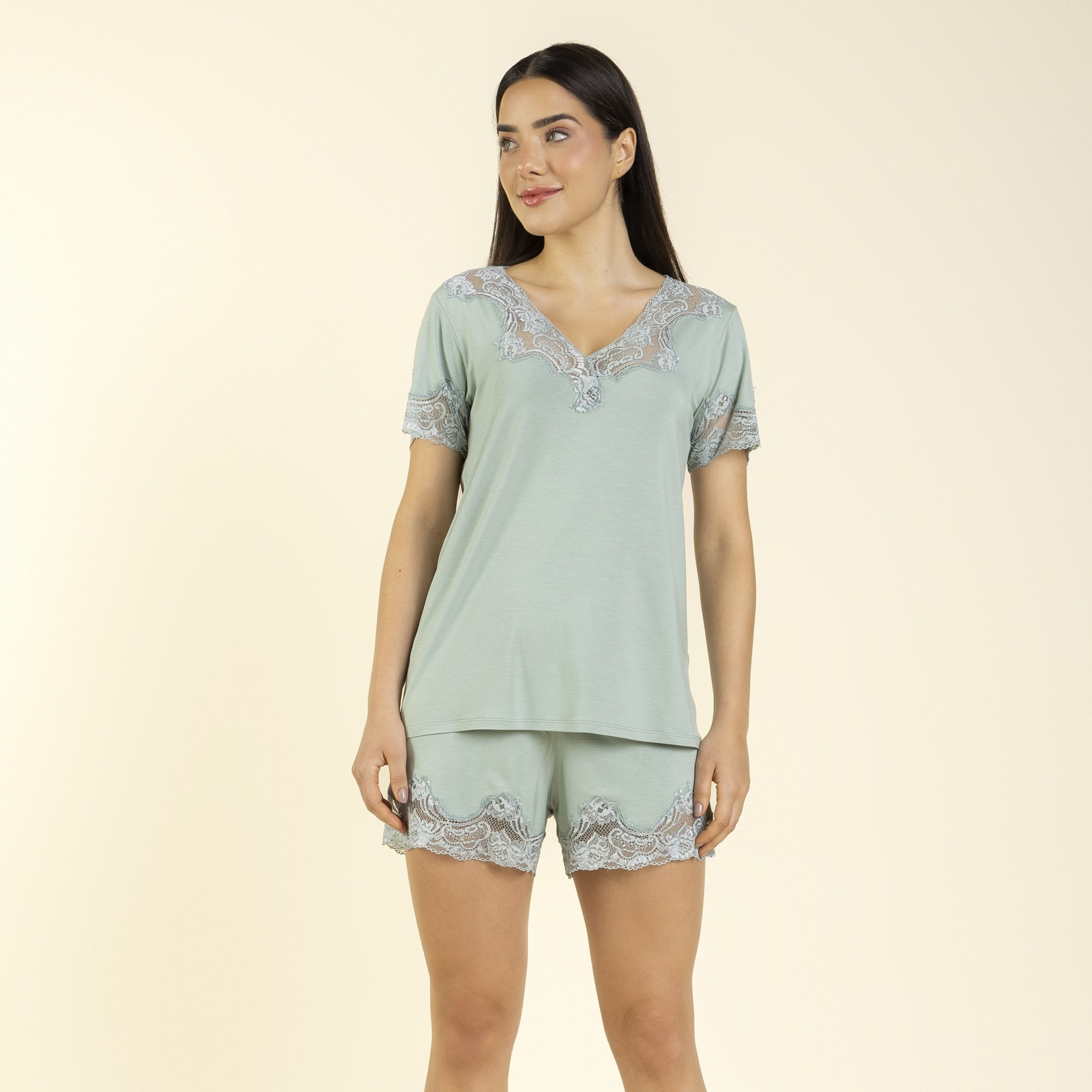 O conjunto na cor verde mint, em visco comfort, tem blusa com decote em V e aplicação de renda no busto e nas mangas, enquanto o short tem detalhe em renda na barra, proporcionando delicadeza e conforto.