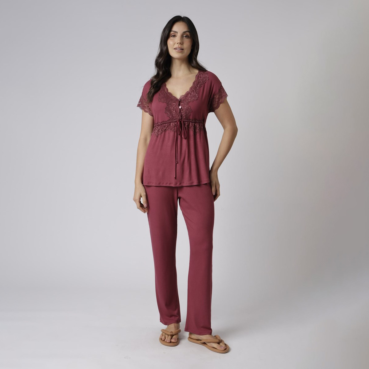 A blusa, em visco canelada, possui botões frontais para abertura prática, detalhe em renda refinada no busto e amarração em cetim para ajuste na cintura. A calça, no mesmo tecido, apresenta caimento confortável e fluido. A cor bordô traz elegância e aconchego ao conjunto.