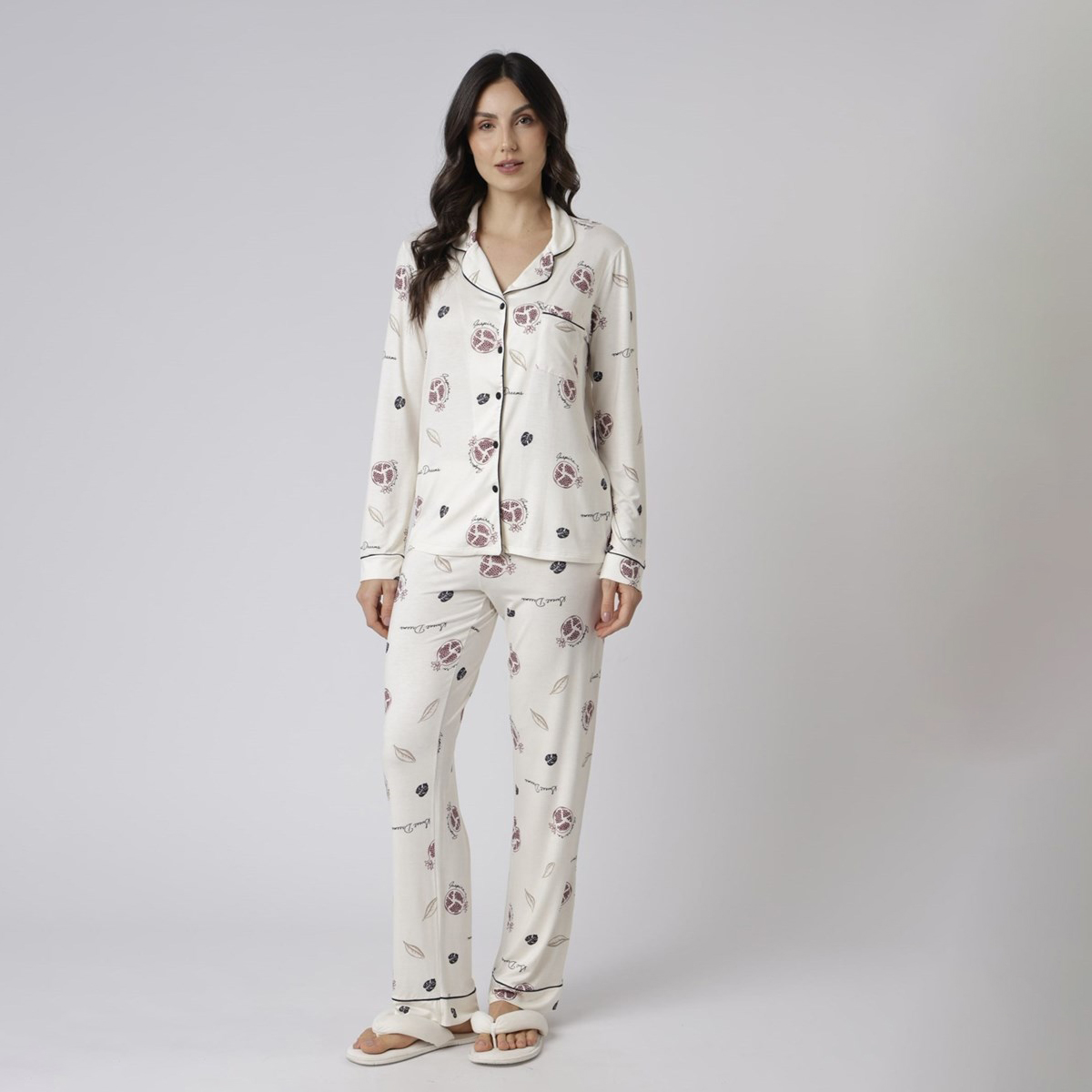 A blusa de manga longa, em visco comfort, possui fechamento frontal por botões e detalhe em viés contrastante no acabamento, enquanto a calça longa, no mesmo tecido, apresenta caimento leve e confortável, ambos em estampa romã delicada.