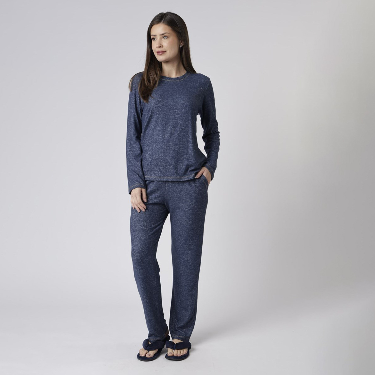 A blusa de manga longa, em cashmere touch, possui costura em tom contrastante que valoriza o design, enquanto a calça longa apresenta bolsos funcionais e caimento confortável. A cor marinho traz elegância atemporal ao visual.