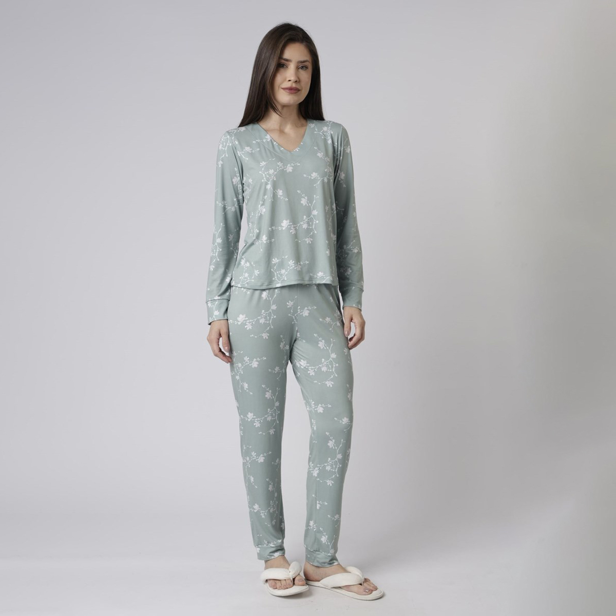 O modelo, em microfibra peach skin, conta com blusa de manga longa com decote suave em ‘V’, punhos e calça longa com punhos e caimento leve. A estampa floral green traz suavidade e elegância para momentos de descanso.