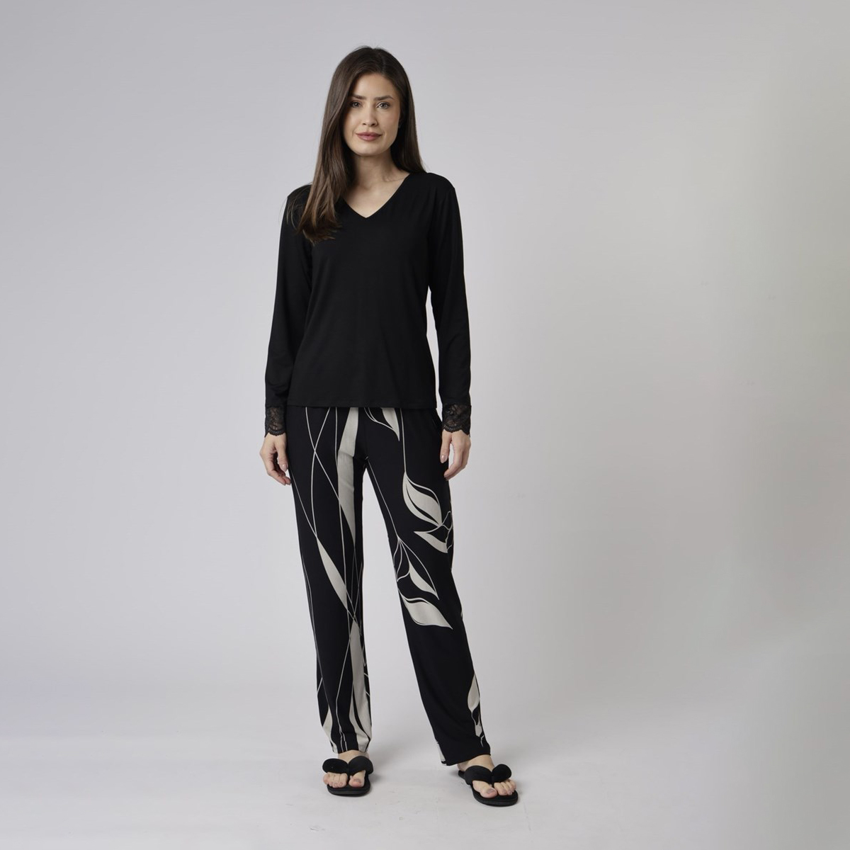 A blusa lisa preta, em visco premium rongeant, possui decote em ‘V’ com recorte embutido e mangas longas com delicado acabamento em renda, trazendo elegância ao visual. A calça longa, no mesmo tecido, em estampa rongeant flower apresenta caimento leve e toque macio, garantindo bem-estar ao longo do uso.