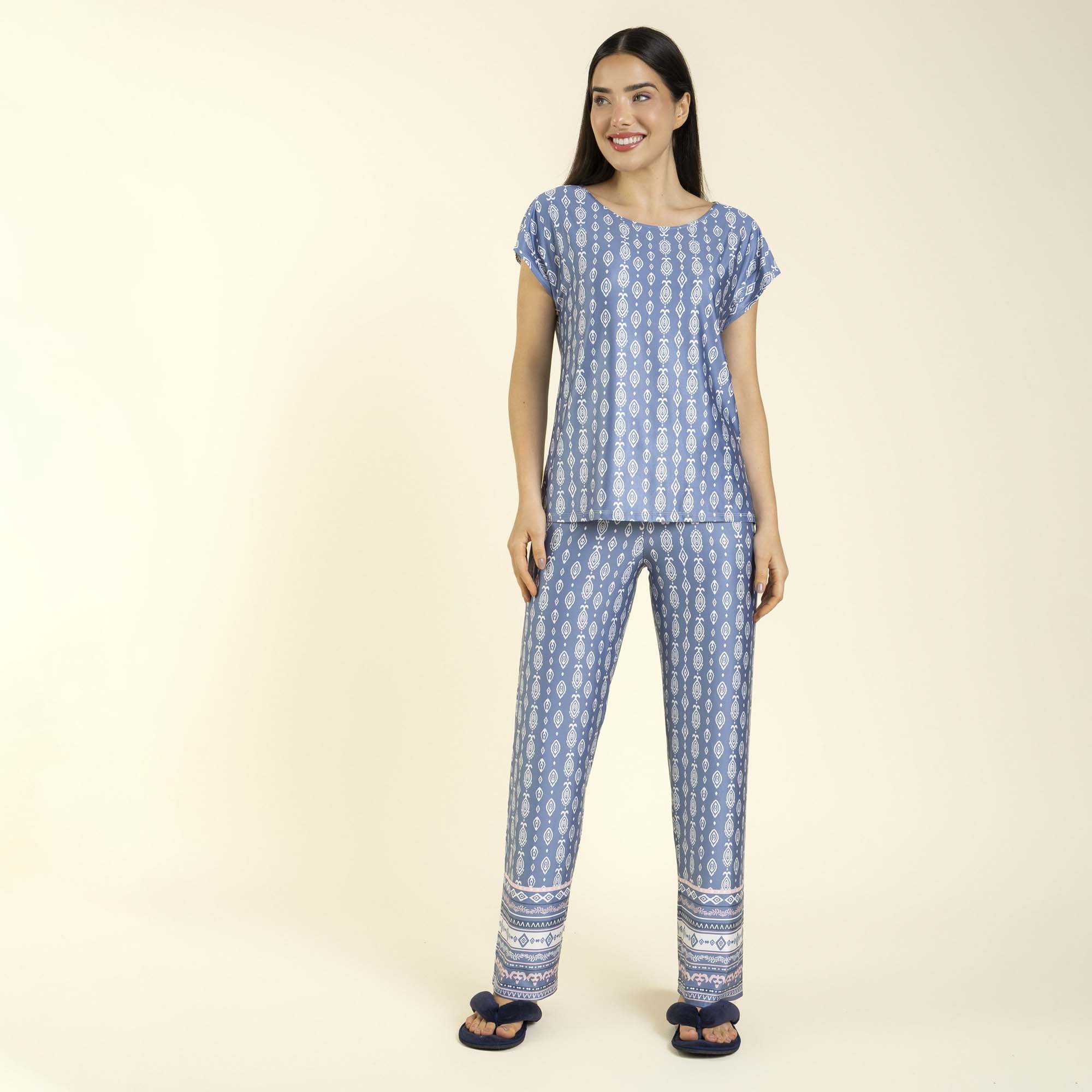 Em microfibra light, vem com blusa de mangas curtas com decote arredondado e calça longa estampada, combinando toque macio e caimento leve.