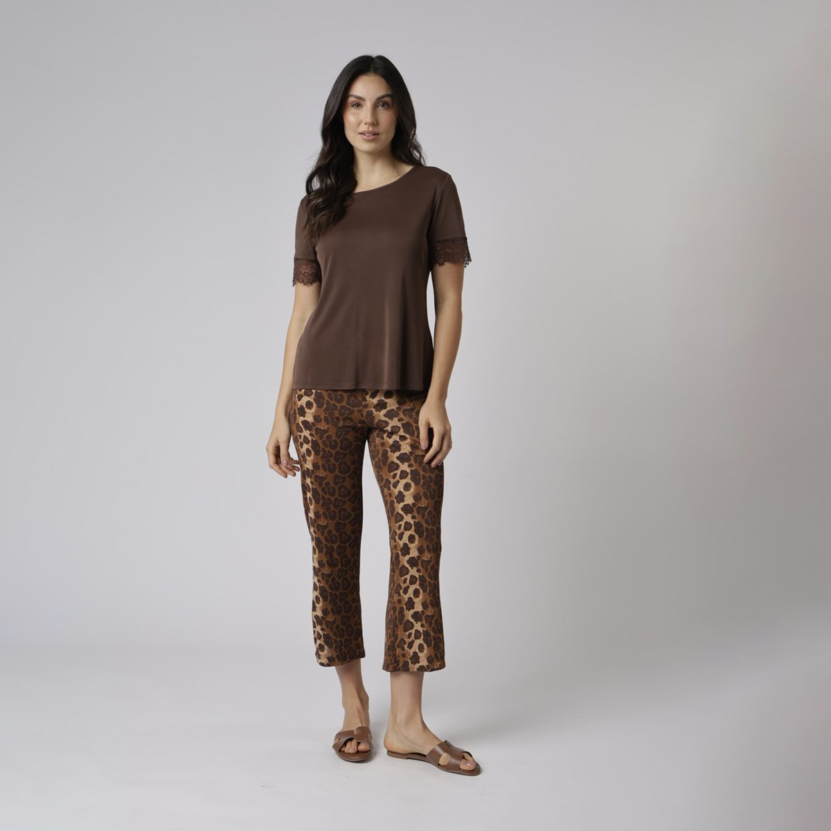O modelo, em microfibra poliamida, possui blusa de mangas curtas marrom com decote canoa e renda na cor do tecido. A calça é modelo pantacourt na estampa onça brown.