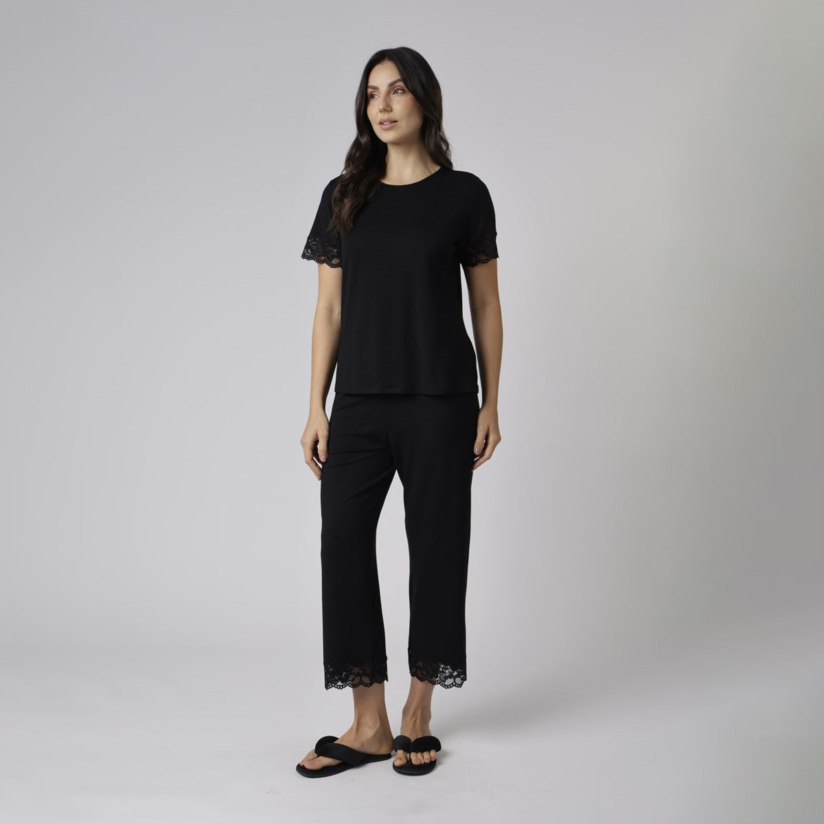 O modelo, em visco comfort, possui blusa de mangas curtas, renda refilada na cor do tecido e calça pantacourt com acabamento delicado, garantindo caimento perfeito, além da elegante cor preta.