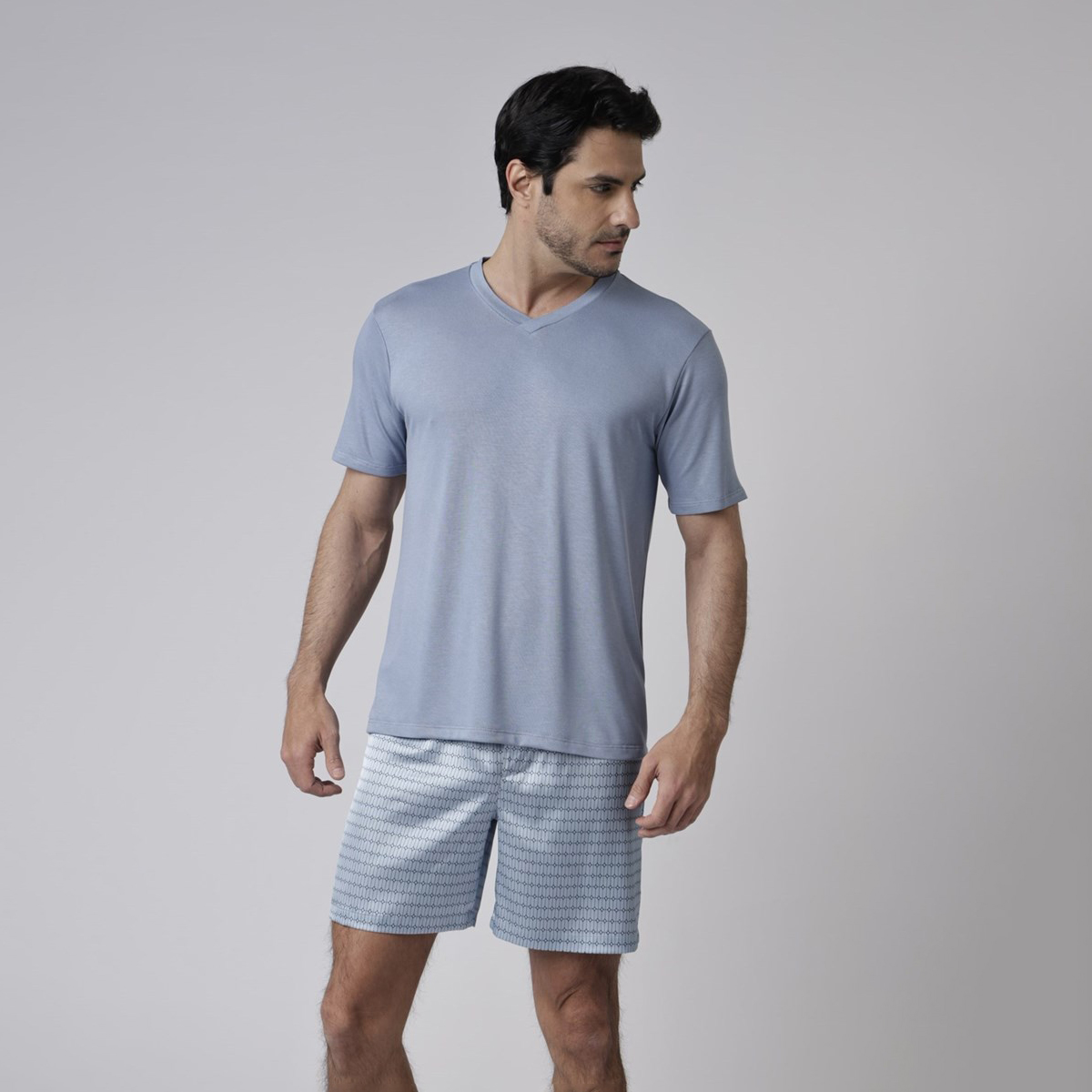 A blusa, em visco tricot, possui toque macio, caimento leve e modelagem confortável, a cor urbano blue reforça a proposta moderna da peça. A bermuda, em cetim gloss na estampa geométrico blue completa o conjunto.