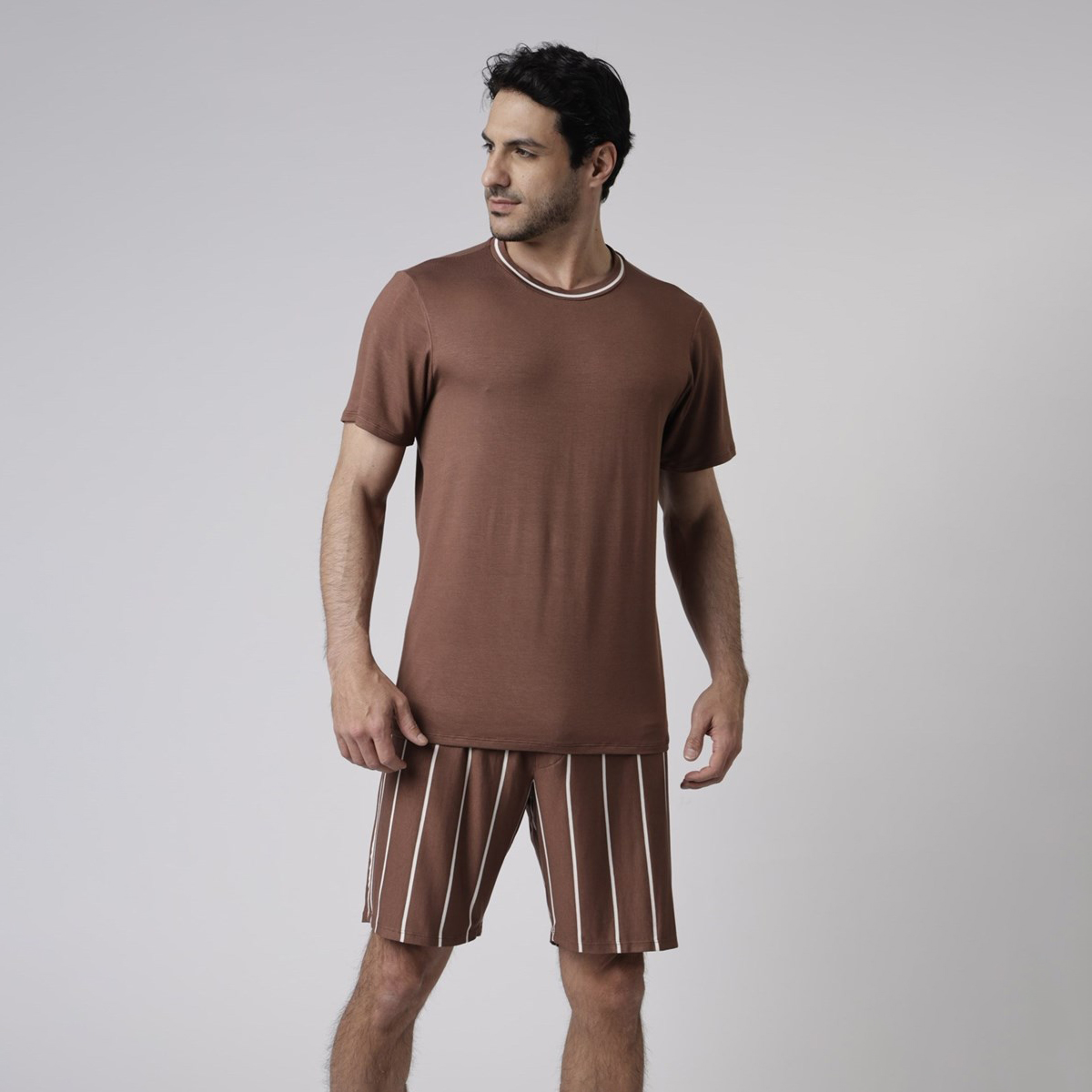 A blusa lisa marrom possui design clean e elegante com gola arredondada e manga curta, enquanto a bermuda listrada em tom cappuccino adiciona charme ao conjunto. O tecido em malha visco garante toque macio e excelente caimento.