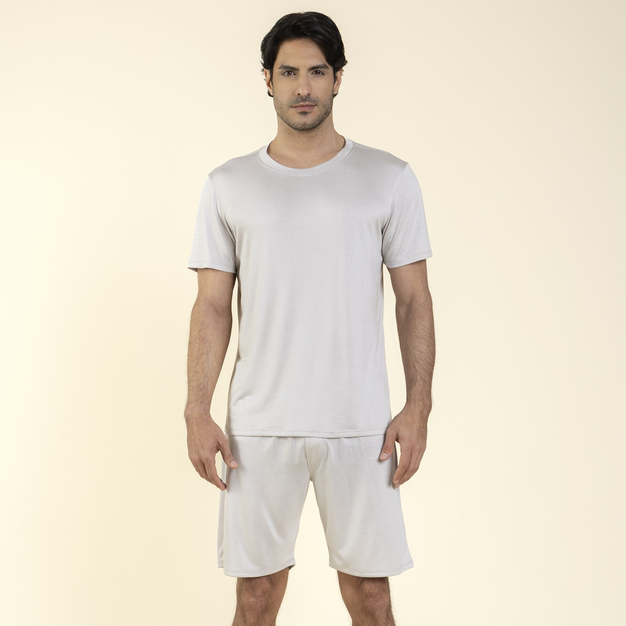 O conjunto é confeccionado em modal, com camiseta de manga curta e gola careca, acompanhada de bermuda com cós confortável. A cor silver garante um visual clean e moderno.