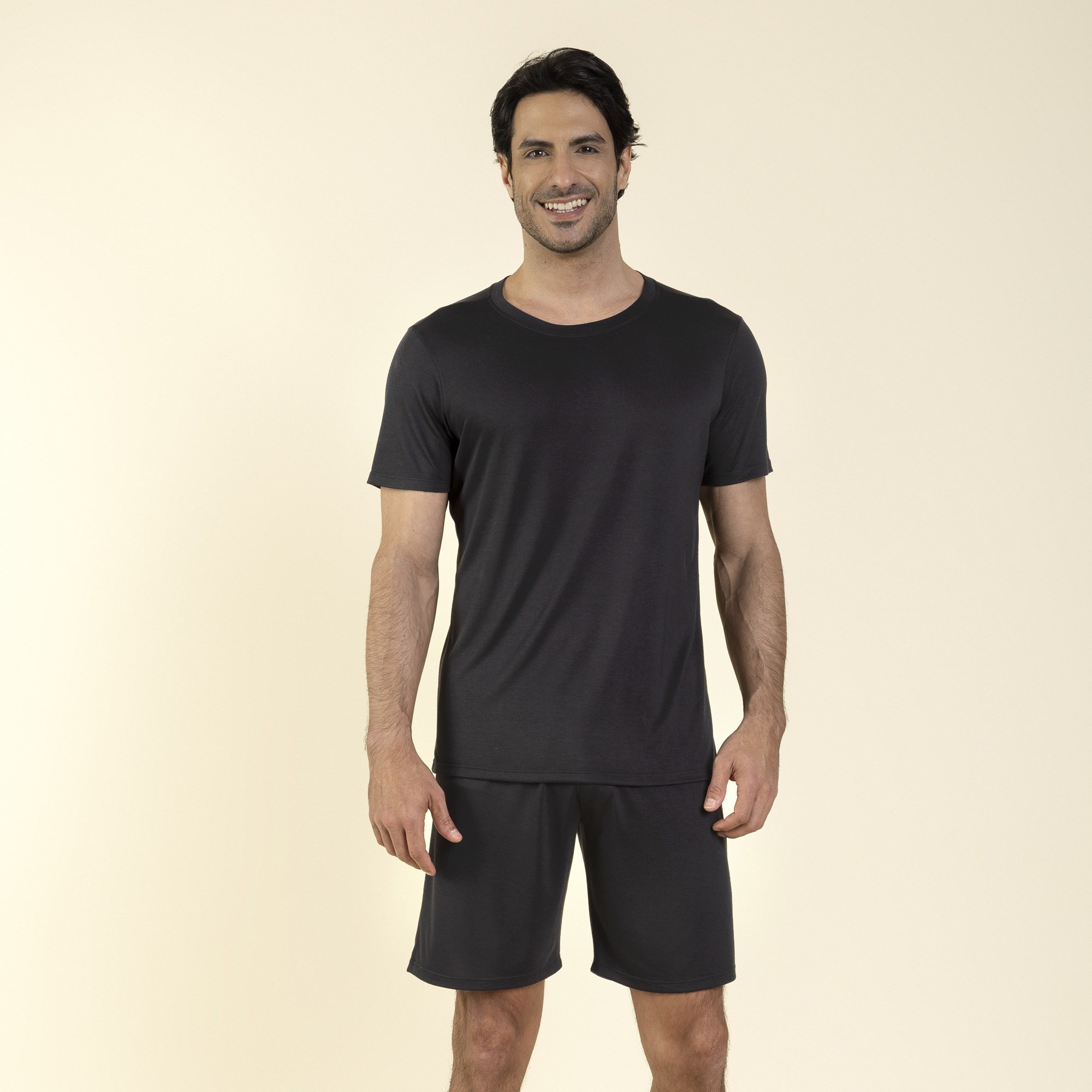 O conjunto é confeccionado em modal, com camiseta de manga curta e gola careca, acompanhada de bermuda com cós confortável. A cor preta garante um visual moderno.