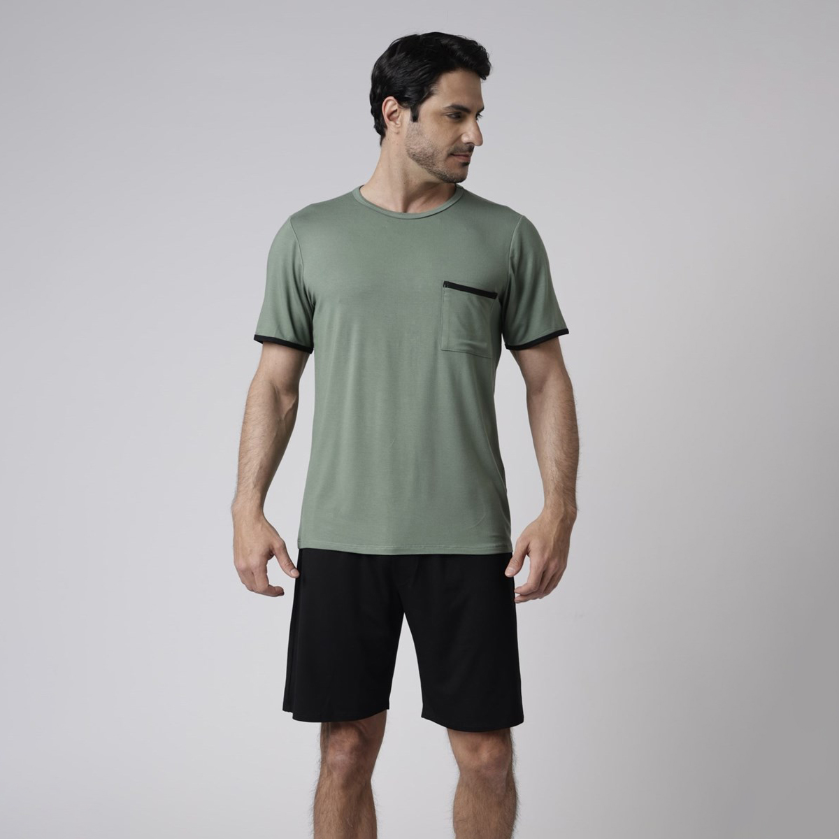 Confeccionado em visco comfort, o modelo possui camiseta verde de mangas curtas, decote arredondado e bolso frontal. A bermuda proporciona leveza e liberdade de movimento, além da clássica cor preta.