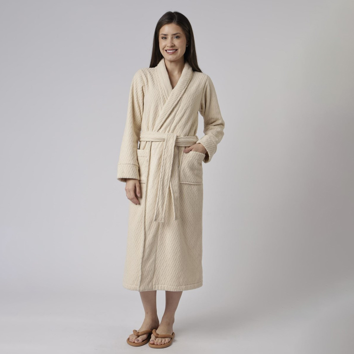 O modelo, em soft jacquard, possui comprimento longo, mangas longas com acabamento embutido, faixa para amarração na cintura e textura delicada que valoriza o visual. A cor creme traz suavidade e elegância.