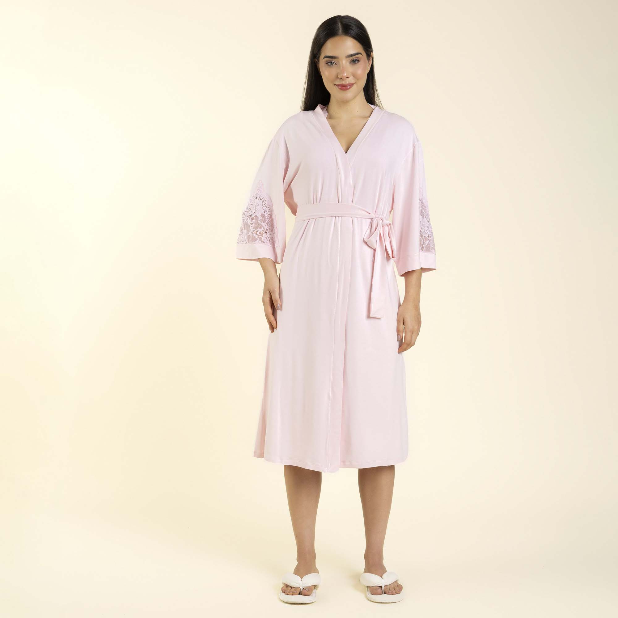 O robe, em visco comfort, é midi, possui cordão para amarrar, cor rosa suave e detalhe em renda na manga.