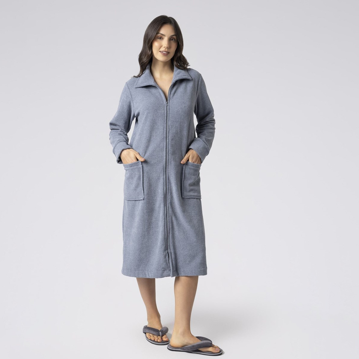 Com comprimento longo, o robe, em soft glacê, possui fechamento em zíper embutido, bolsos frontais amplos e fenda discreta na barra, o modelo oferece praticidade sem abrir mão da elegância. A cor azul traz um toque moderno e sofisticado.