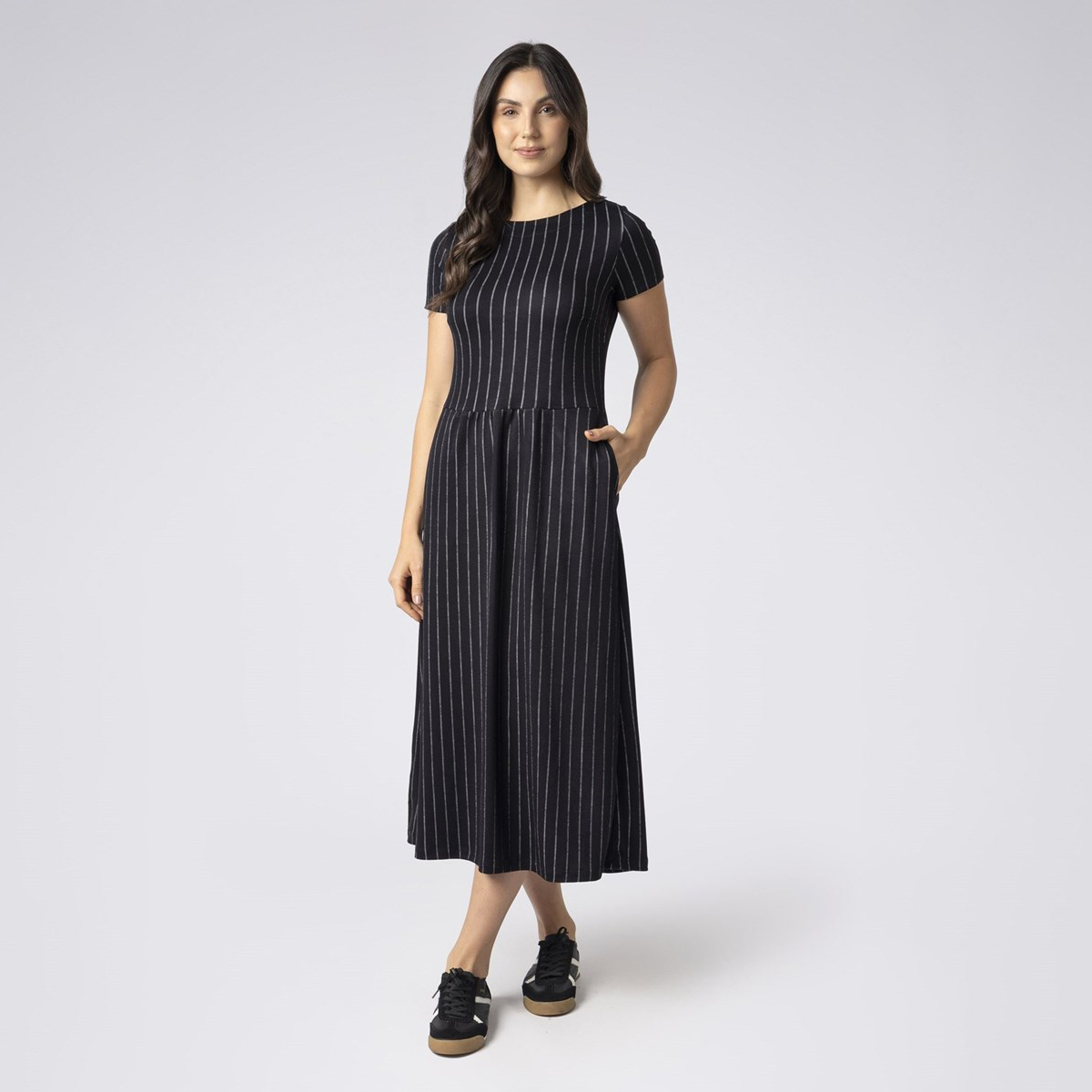 Produzido em visco jacquard listrada, o modelo possui comprimento midi, mangas curtas, leve franzido na cintura, bolsos funcionais e caimento fluido. A cor preta garante versatilidade e um visual atemporal.