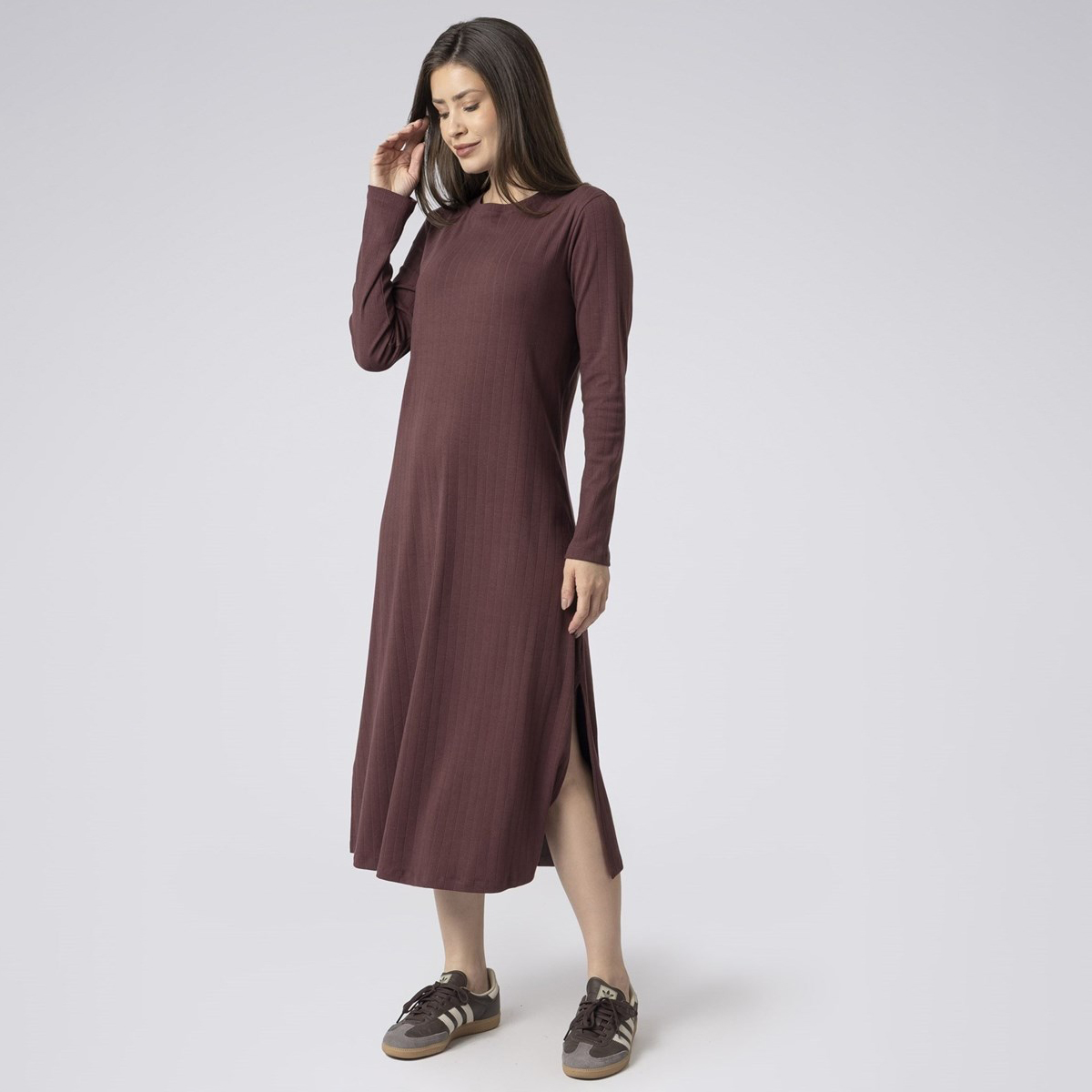 Produzido em canelado moderne, o modelo possui mangas longas, comprimento midi e fenda lateral que garante liberdade de movimento. A cor bordô adiciona profundidade e charme à peça.